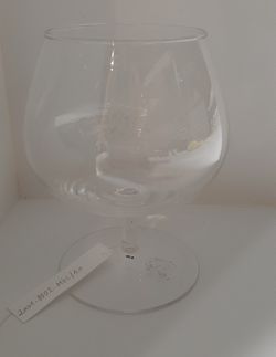 "Cognacglas van het stadhuisservies Den Haag. Centraal staat het logo van de stad: een ooievaar met een aaltje in zijn bek, afgebeeld tegen een schild en bekroond met een kroon, links en rechts geflankeerd door een leeuw. Het servies van de gemeente Den Haag, heeft naast verschillende types glazen ook dessertborden, ontbijtborden, diepe borden, grote borden, kopjes met schotel."