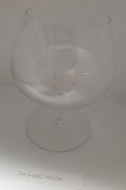 "Cognacglas van het stadhuisservies Den Haag. Centraal staat het logo van de stad: een ooievaar met een aaltje in zijn bek, afgebeeld tegen een schild en bekroond met een kroon, links en rechts geflankeerd door een leeuw. Het servies van de gemeente Den Haag, heeft naast verschillende types glazen ook dessertborden, ontbijtborden, diepe borden, grote borden, kopjes met schotel."