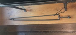 Vuurtang waarvan de twee armen een afgeplat uiteinde hebben. In het scharnierende deel komen zij samen in een steel met knopje op het uiteinde. De vuurtang hoort bij een oven waarin brandijzers verhit werden.