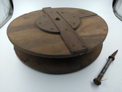 Houten katrol met een ijzeren as. De katrol is met ijzeren schroeven gemonteerd en heeft een losse pin van ijzer met aan een zijde een schroefdraad met een moer.