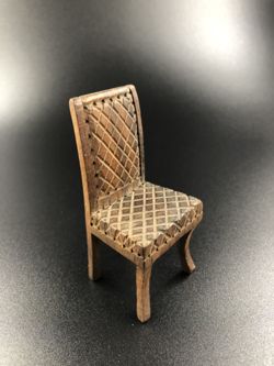 Een uit hout gezaagde stoel, welke versierd is met in het hout, met de hand, gesneden ruit motieven, en gaatjes, als zijnde bevestigingen. De rugleuning is licht gebogen. De voorste poten zijn naar binnen gebogen. De achterzijde van de rugleunig is ook versneden met lijnen waardoor het lijkt alsof de poten doorlopen in de rugleunig en als kader vormen voor de rugleuning.
