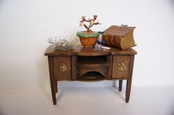 Houten dressoir op pootjes. Een plat kastje van bruin hout met vier rechte pootjes en een accolade gevormde voorzijde. Het kastje heeft ter weerszijden een diepe hoge lade, met rond koperbeslag en ringetje, en hiertussen twee open planken, boven de onderste slechts een lage halfronde opening. Op het dressoir staat een kandelaar van ongekleurd en blauw boheems glas met een rond opengewerkt randje van getrokken ongekleurd glas en hierop een gedraaide kandelaar met halferwege en bovenop een blauwe druppelvanger. In de kandelaar staat een witte glazen kaars met een rood puntje. Het dressoir staat in de eetkamer van het Grote Poppenhuis.