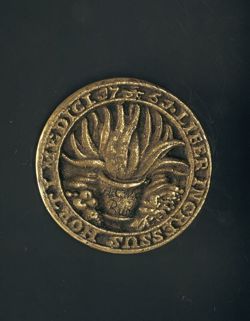KZ: Een pot met aloë tussen twee hoorns des overvloeds. Op de pot is gegraveerd: F. van ROYEN. Langs de rand is het omschrift: LIBER INGRESSUS HORTI AEDICI 17 5/10 51. (= Vrije toegang tot de hortus medicus, 5 oktober 1751)"