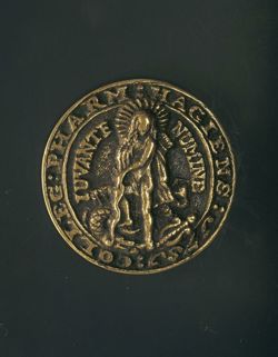 "VZ: Appolo met pijlenkoker en boog, door stralenkrans omgeven en een vertrapte met pijl gedoode slang/python. Naast hen ligt een lier. Aan de linker kant de tekst: IUVANTE en rechts de tekst: NUMINE. (= met Gode hulp). Langs de rand is rondom de tekst: COLLEG(ium) PHARM(aceuticarum) HAGIENS(ium) (= Genootschap van Haagse Apothekers)1751.